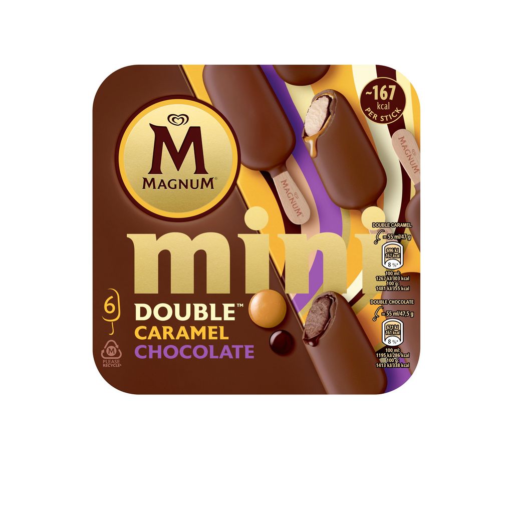 Glace bâtonnet Double Caramel Chocolat Magnum, format mini, 6 glaces de 55 ml.