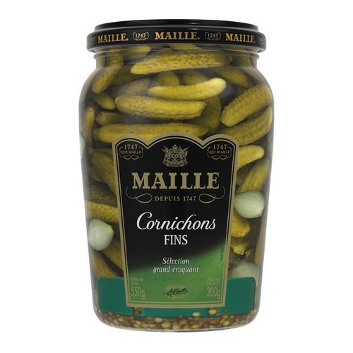 Croquants et acides, les cornichons de la Maison Maille équilibrent à la perfection la dégustation d’une terrine de viande, d’un bon pâté et de fromages. Compagnons rêvés pour grignoter sur le pouce, les cornichons décorent et agrémentent avec bonheur une assiette de salami ou de jambon sec. Avec leurs saveurs fraîches et délicieuses, ils se dégustent avec un steak tartare, une sauce gribiche ou vos salades de pommes de terre. Depuis près de 270 ans de tradition créative et de savoir-faire, la Maison Maille est animée par la passion d'explorer les saveurs et de faire grandir celle pour la cuisine. Fondée par Antoine-Claude Maille, maitre vinaigrier, il ouvre sa première boutique de condiments à Paris en 1747, où l’on peut découvrir la richesse de ses moutardes aromatisées. Il devient ensuite le fournisseur officiel de la cour du roi Louis XV et accède ainsi à la célébrité. Héritiers d'une créativité cultivée depuis près de 3 siècles, les chefs de la Maison Maille conçoivent chaque recette comme une œuvre d'art culinaire. Leur obsession : explorer, sélectionner, et associer les meilleurs ingrédients pour apporter son supplément d'âme à chaque recette. Le condiment Maille est la touche qui réveille et révèle la beauté d'un plat. Une touche de créativité qui exacerbe le goût, accroît le plaisir et comble les gourmets les plus exigeants… Les produits de la marque Maille invitent à un voyage dans le monde des saveurs. Avec comme passagers de choix : le savoir-faire, la passion du détail, l’art de la nuance et le raffinement. Pour une expérience immersive dans l'univers Maille, rendez-vous dans nos boutiques à Paris, Dijon et Bordeaux. Découvrez nos recettes sur www.maille.com, ainsi que le reste de notre gamme de cornichons extra fins, cornichons mini et cornichons aigre-doux.