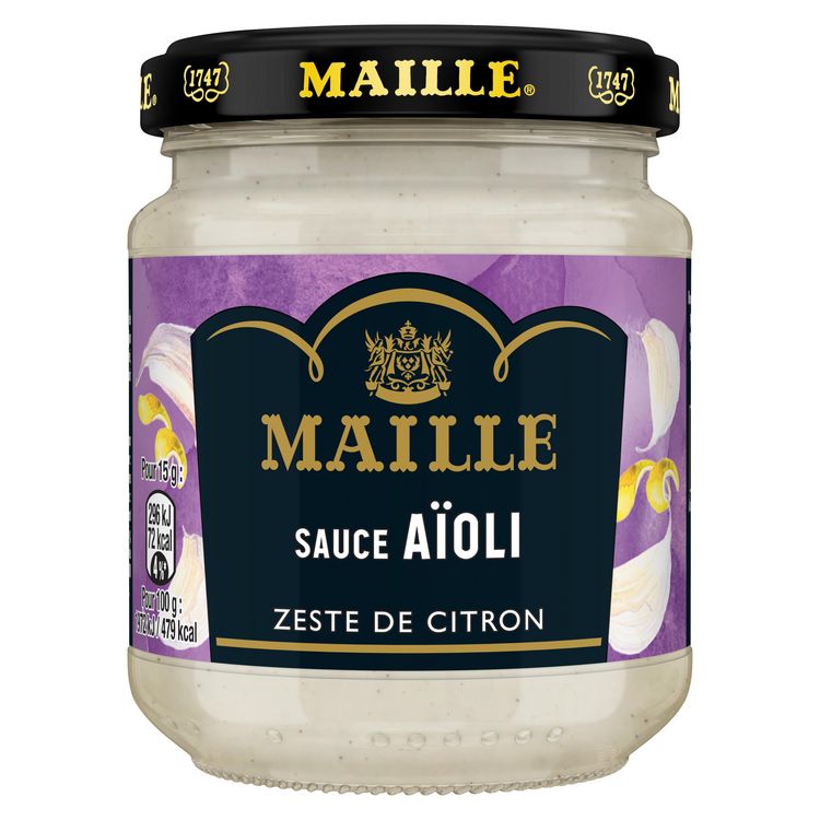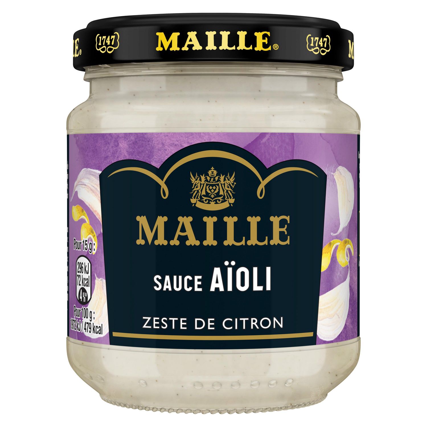 Une sauce Aïoli 185 g Maille® onctueuse relevée par le peps du zeste de citron, qui accompagnera parfaitement tant vos fruits de mer que vos légumes crus ou cuits. Une sauce Maille® raffinée et préparée avec des ingrédients de qualité : sans colorants ni arômes. Dans la même gamme, découvrez aussi notre Sauce Tartare, notre Sauce Bourguignonne et notre Sauce Béarnaise Maille. Mille et une façons d'exprimer votre créativité avec cette délicieuse gamme de 4 sauces d'accompagnement Maille®, parfaites pour agrémenter vos apéritifs et vos repas d'une note gourmande et délicate. Entre tradition et touche de modernité, découvrez des associations de saveurs uniques pour accompagner et relever vos viandes, poissons, burgers, légumes et bien plus encore... Depuis plus de 275 ans de tradition créative et de savoir-faire, Maille® est la touche qui réveille et révèle la beauté d'un plat. Une touche de créativité qui exacerbe le goût, accroît le plaisir et comble les gourmets les plus exigeants… Héritiers d'une créativité cultivée depuis près de 3 siècles, les chefs de la Maison Maille conçoivent chaque recette comme une œuvre d'art culinaire. Leur obsession : explorer, sélectionner, et associer les meilleurs ingrédients pour apporter son supplément d'âme à chaque recette. Les produits Maille® invitent à un voyage dans le monde des saveurs. Avec comme passagers de choix : la passion du détail, l'art de la nuance et le raffinement.