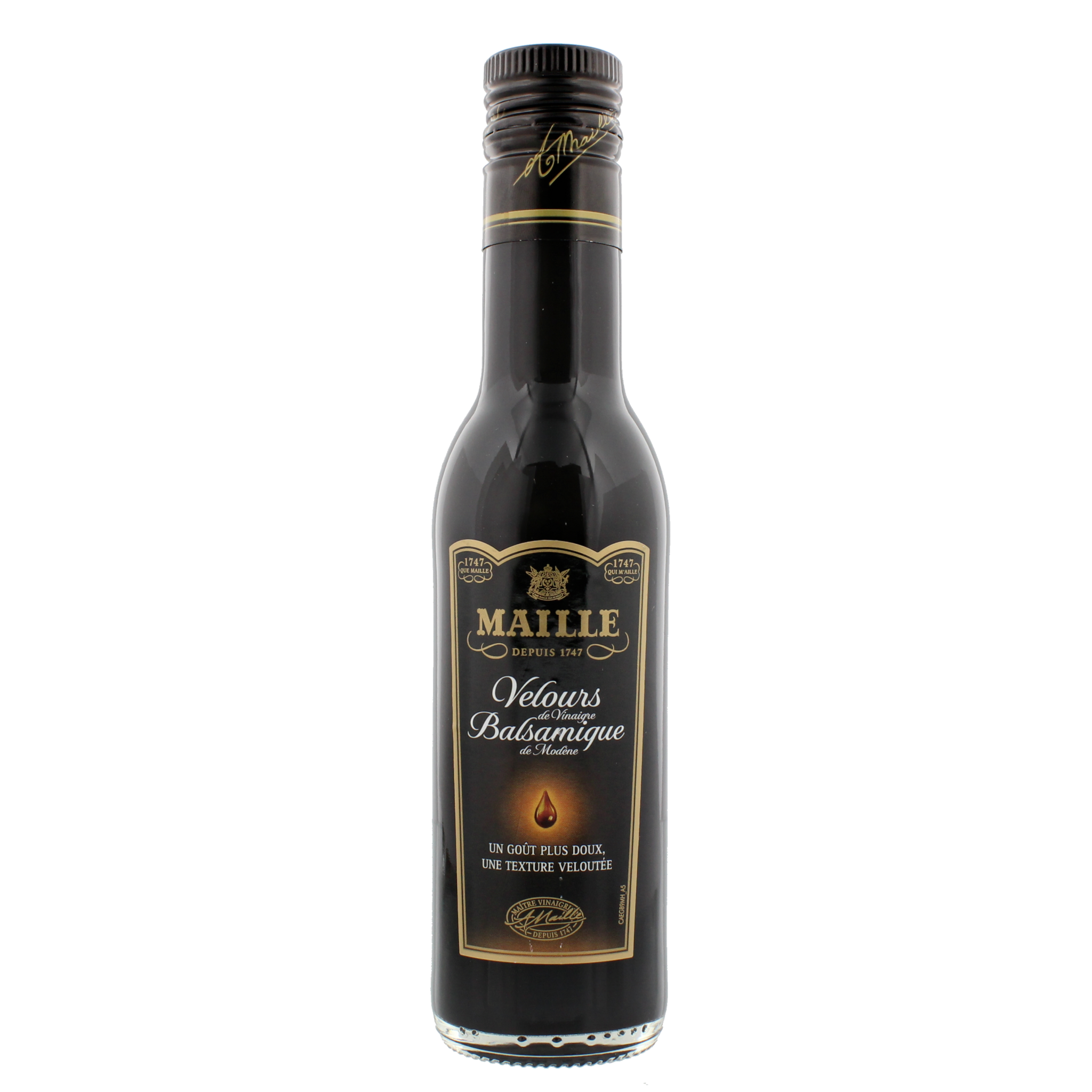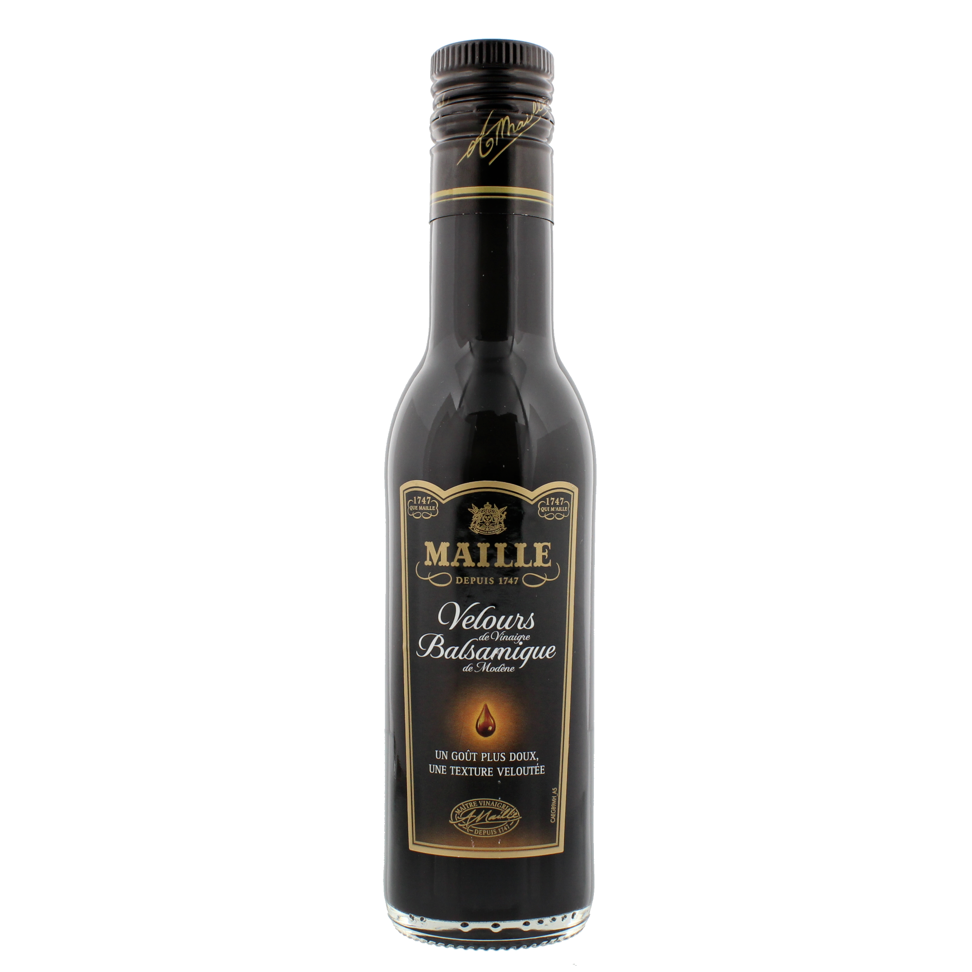 Je connais Maille depuis longtemps... et j'ai beaucoup apprécié les produits de cette marque. Moins, cependant, depuis qu'Unilever l'a rachetée... Mettant ainsi une Maille à l'envers... Car depuis, je n'achète plus que le Velours de vinaigre balsamique. Non pas tant pour le goût (en la matière, il y a évidemment bien mieux), mais parce c'est le seul "velours" que je connaisse et qu'Auchan propose à la vente. La version "velours" du vinaigre balsamique de cette marque a de ce fait une saveur plus concentrée, et la texture plus dense donne davantage de goût et permet de mieux maîtriser la quantité d'assaisonnement. C'est aussi pour ces raisons que je déconseille de l'associer à l'huile d'olive, dont ce vinaigre me semble avoir la tendance à "tuer" le parfum d'olive.