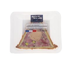 Une forme triangulaire qui surprendra en rayon comme dans l'assiette. Le pâté est composé de généreux morceaux de viande, exclusivement origine France. Le coeur, en mousse de foie gras et maigre de canard, est mis en valeur visuellement et gustativement par les champignons cuisinés. Les pistaches apportent une note de couleur et de croquant. La gelée, fabriquée à partir d'un bouillon de volaille maison, confère à ce produit son goût unique. La croûte vient sublimer l'ensemble par son croustillant et son bon goût de beurre (pâte pur beurre).