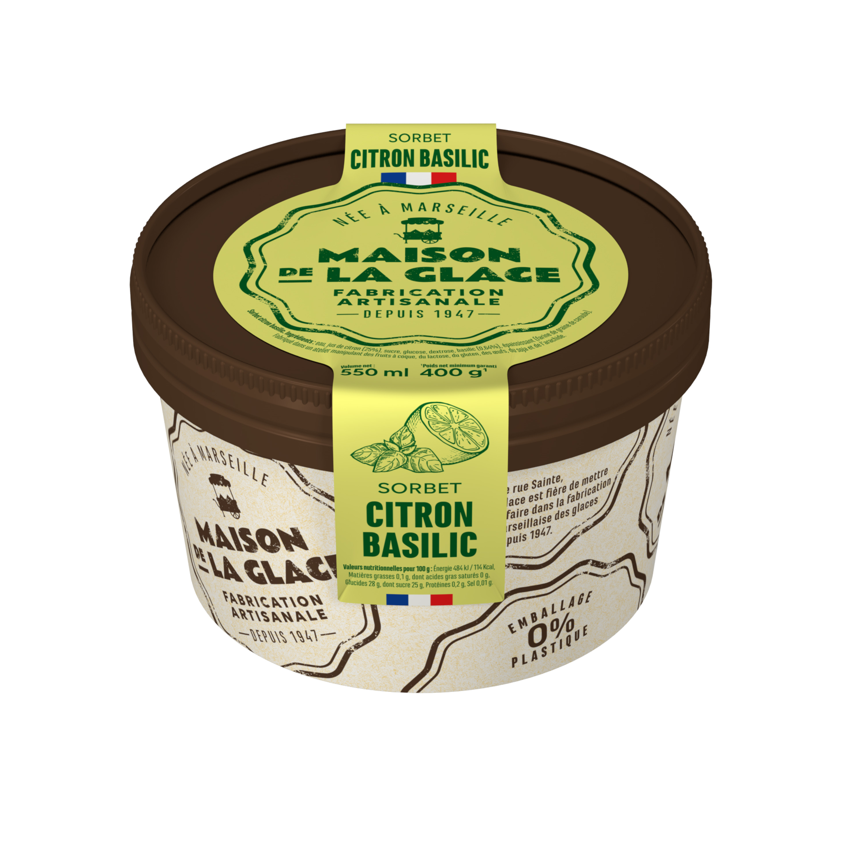 Ingrédients : Eau, jus de citron (25%), sucre, glucose, dextrose, basilic (0,64%), épaississant (farine de graine de caroube)