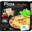 Garniture: Maroilles 19,6% (contient LAIT), Mozzarelle râpée 15,2% (Mozzarelle (contient LAIT), fécule de pomme de terre), purée de tomates, crème liquide 6,5% (crème de LAIT, gélifiants : carraghénanes), huile de tournesol, sel sucre, épices et plantes aromatiques (ail, oignon, origan, herbes de Provence, poivre), arômes naturels. [Pourcentages exprimés sur le poids total]