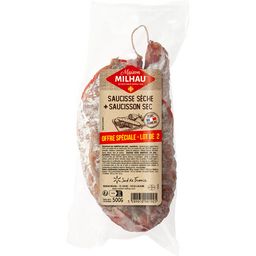 Boyau naturel, sans colorant, séchage à 800 m d'altitude. Produit souple à sec, avec marquant de maigre et de gras, goût de salaisons.