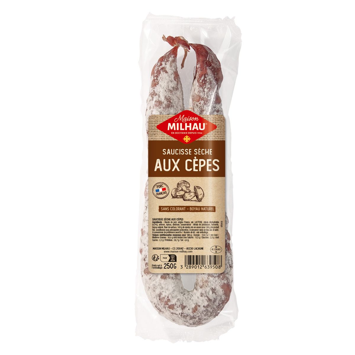 Viande de porc, sel, LACTOSE, cèpes déshydratés (0.9 %), arômes, épices, dextrose, conservateur : E 252, ferments, boyau naturel, fleur de surface.