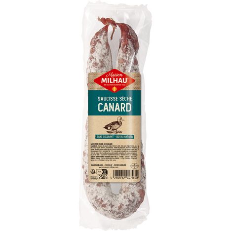 Viandes de canard (50 % mini) et de porc, sel, LACTOSE, épices, dextrose, conservateur : E 252, arômes et arôme de fumée, ferments, boyau naturel, fleur de surface.