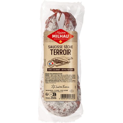 Boyau naturel, sans colorant, séchage à 800 m d'altitude. Produit souple à sec, avec marquant de maigre et de gras, goût de salaisons.