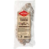 Boyau naturel, sans colorant, séchage à 800 m d'altitude. Produit souple à sec, avec marquant de maigre et de gras, goût de salaisons.