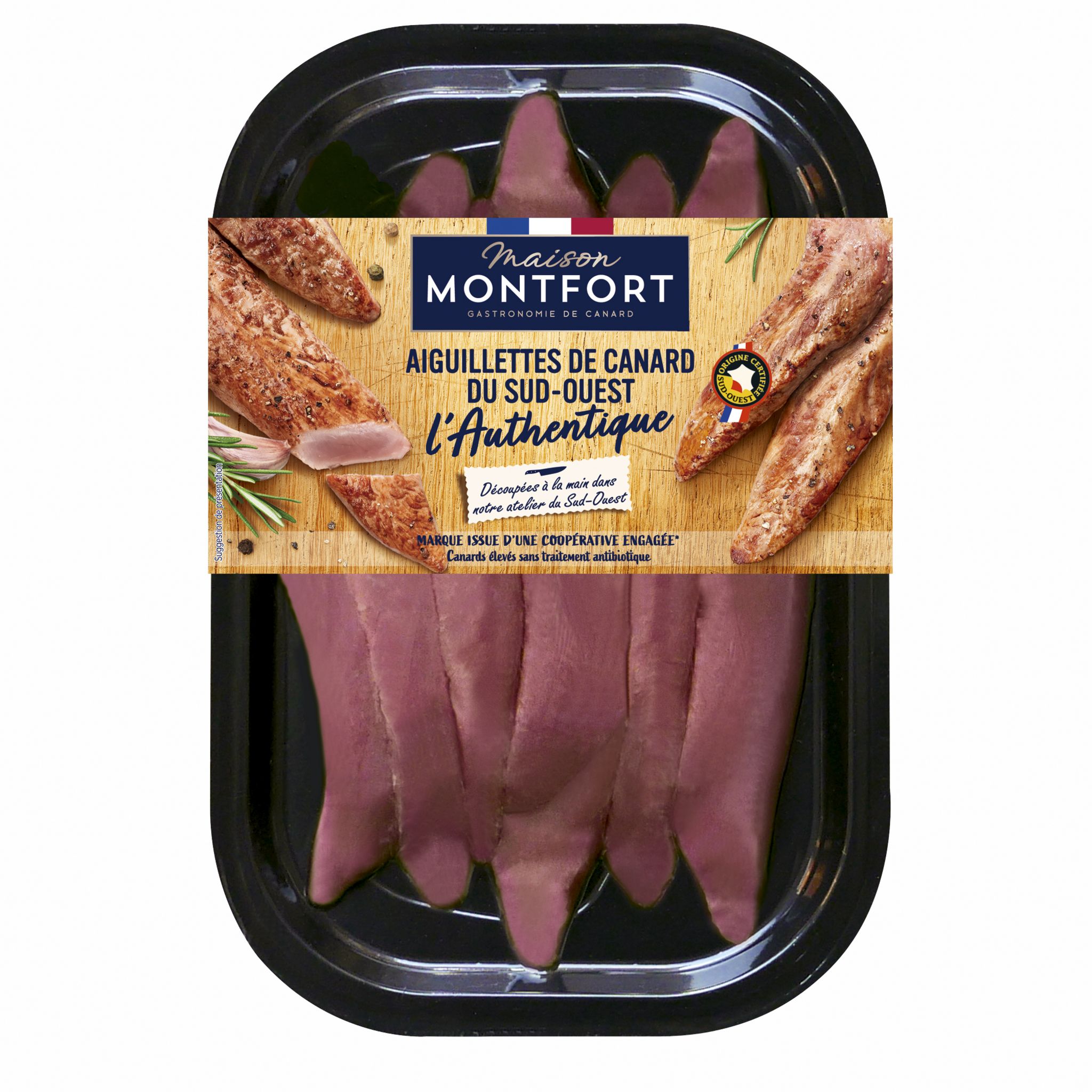Rapides et savoureuses, faites-vous plaisir avec les aiguillettes de canard certifiées IGP Sud-Ouest. Avec Maison Montfort, ce canard IGP a été élevé au sein d'exploitations à taille humaine, sans aucun traitement antibiotique et nourris avec une alimentation sans OGM (<0,9%). Notre conseil de cuisson : saisir simplement les aiguillettes 2 minutes de chaque côté.
