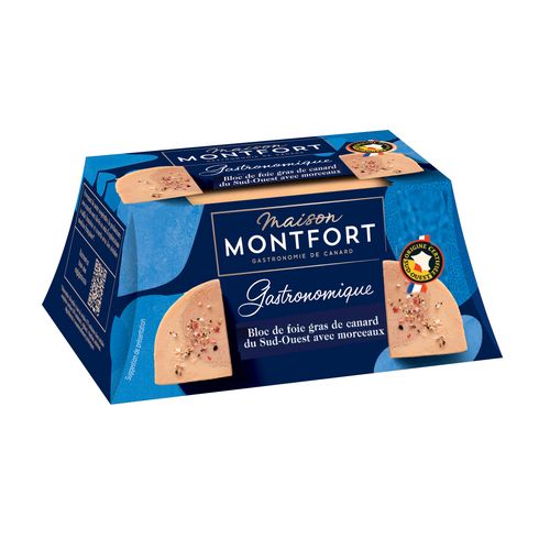 Maison Montfort présente son bloc de foie gras de canard Gastronomique avec 30% morceaux . Retrouvez notre recette originale à la pointe d'Armaganc pour plus de rondeur. et une expérience gustative unique.. Une maîtrise sans faille pour révéler de nos foies gras dans cuisson douce pour une texture fondante en bouche. Provenant de notre coppérative de producteurs, nos canards sont élevés au sein d'exploitations à taille humaine et nourris avec des céréales moulues françaises.
