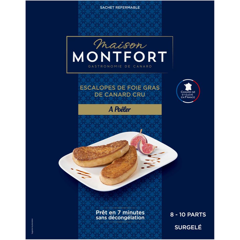 foie gras de canard cru en escalope surgelé 450g Des escalopes de foie gras déjà tranchées et protégées dans un sachet en aluminium refermable Une préparation facile et rapide sans décongélation Une fraîcheur garantie et une fonte limitée grâce au procédé de surgélation du foie Une origine France garantie Une souplesse d’utilisation grâce à une DLC de 12 mois pour des repas improvisés