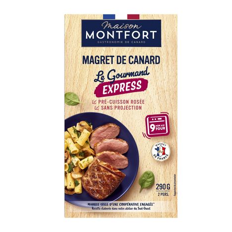 La gourmandise du magret sans contrainte ? Faites vous plaisir avec un magret de canard en seulement 9 minutes au four ! Cuisine Express, c'est une viande pré-cuite dans notre atelier du Sud-Ouest, qu'il vous suffit de réchauffer au four ou juste 2 minutes au micro-ondes, sans projection ni odeur. Avec Maison Montfort, ce canard origine France a été élevé au sein d'exploitations à taille humaine, et nourris avec une alimentation sans OGM (<0,9%).