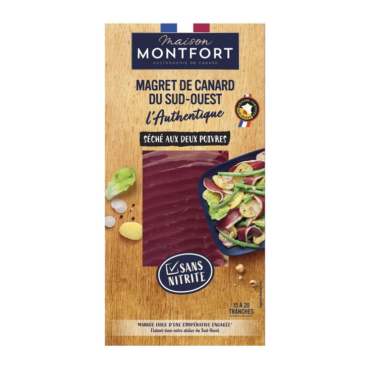 Et si vous donniez un goût de Sud-Ouest à vos salades ? Faites vous plaisir avec des magrets fumés sans conservateur ! Découvrez le caractère d'une viande fumée traditionnellement au bois de hètre et tranchée finement. Avec Maison Montfort, nos canards certifiés IGP Sud-Ouest ont été élevés au sein d'exploitations à taille humaine, et nourris avec une alimentation sans OGM (<0,9%). Notre conseil : sortez le produit de son emballage 15 min avant dégustation.