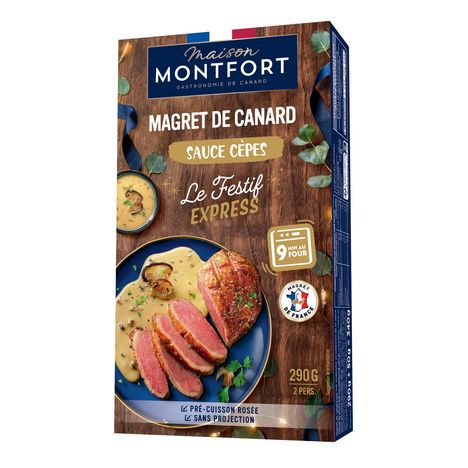 pMagret de canard précuit assaisonné (290g) - Ingrédients : Magret de canard, sel, poivre/ppSauce aux cèpes, aromatisée (50g)- Ingrédients :Eau, CREME fraîche, champignons forestiers (10%: bolet, cèpe, pholiote, shiitaké, lactaire), cèpe (8,7%), amidon modifié, caramel (sucre, eau, sirop de glucose-fructose), graisse de canard, arômes naturels, sel, jus concentré de champignon (0,2%), conservateur : sorbate de potassium, poivre blanc/p