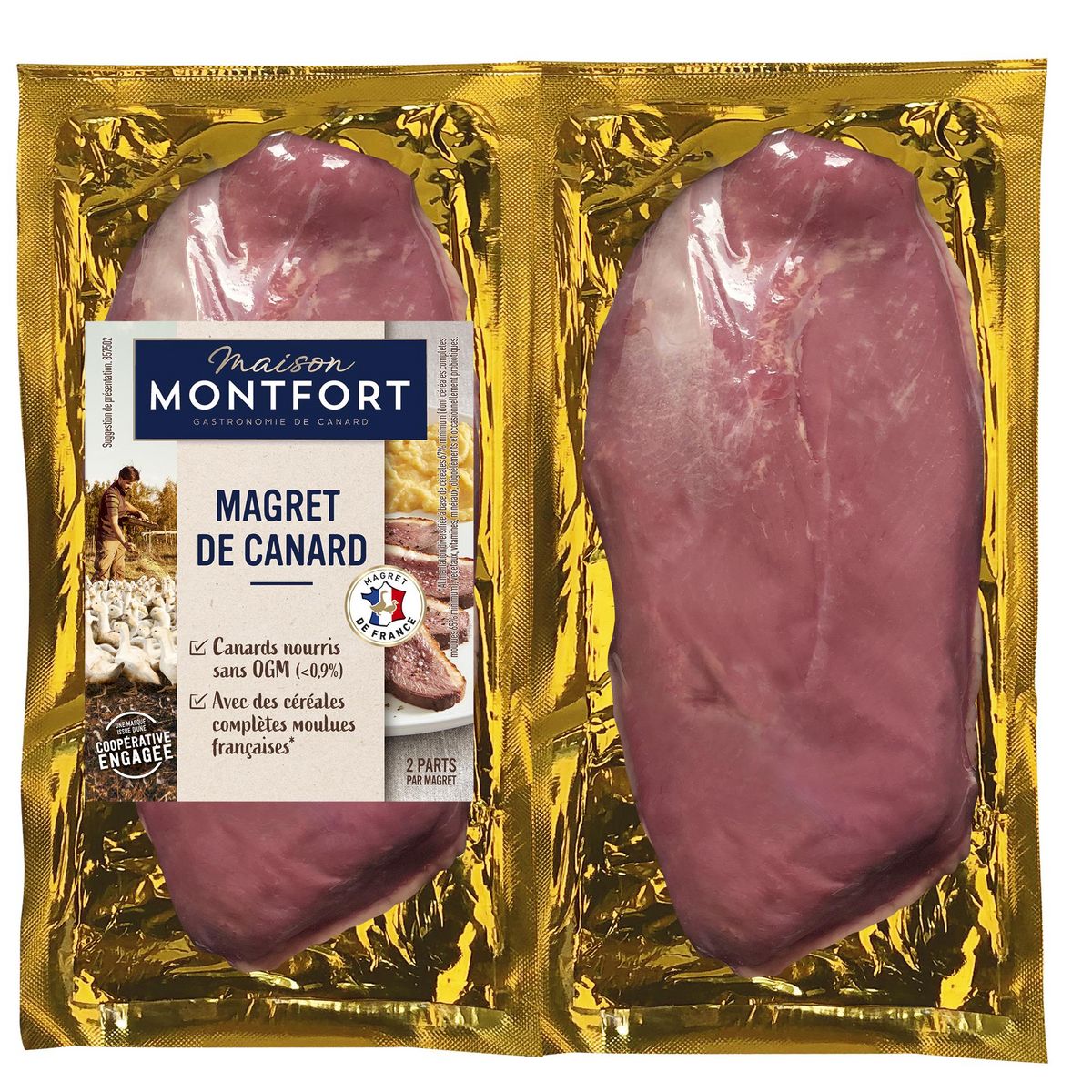 Faites plaisir à vos proches avec un bon magret de canard ! Avec Maison Montfort, ce canard origine France a été élevé au sein d'exploitations à taille humaine, et nourris avec une alimentation sans OGM (<0,9%). Notre conseil de cuisson : après avoir quadrillé la peau, cuire 8-10 minutes côté peau et 4 minutes côté viande.