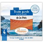 Ingrédients : Truite fumée au bois de hêtre 97%, sel 3% (Sel de l'Île de Ré 55%, sel fin sec 45%). - Espèce Oncorhynchus mykiss.