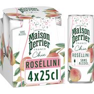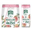 Boisson pétillante sans alcool, au jus de pêche à base de concentré, aromatisée. Saveurs pêche et rosé sans alcool.