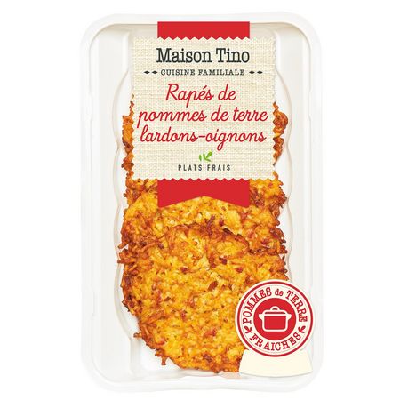 Ingrédients : Pommes de terre origine France 66%, farines de blé et de pommes de terre, lardons cuits fumés 10% (poitrine de porc origine UE, eau, sel, dextrose, conservateurs : érythorbate de sodium, nitrite de sodium), graisses végétales (palme*, tournesol), œufs entiers, eau, oignon sec 1.7%, crème fraîche, sel, persil, poivre, curcuma.