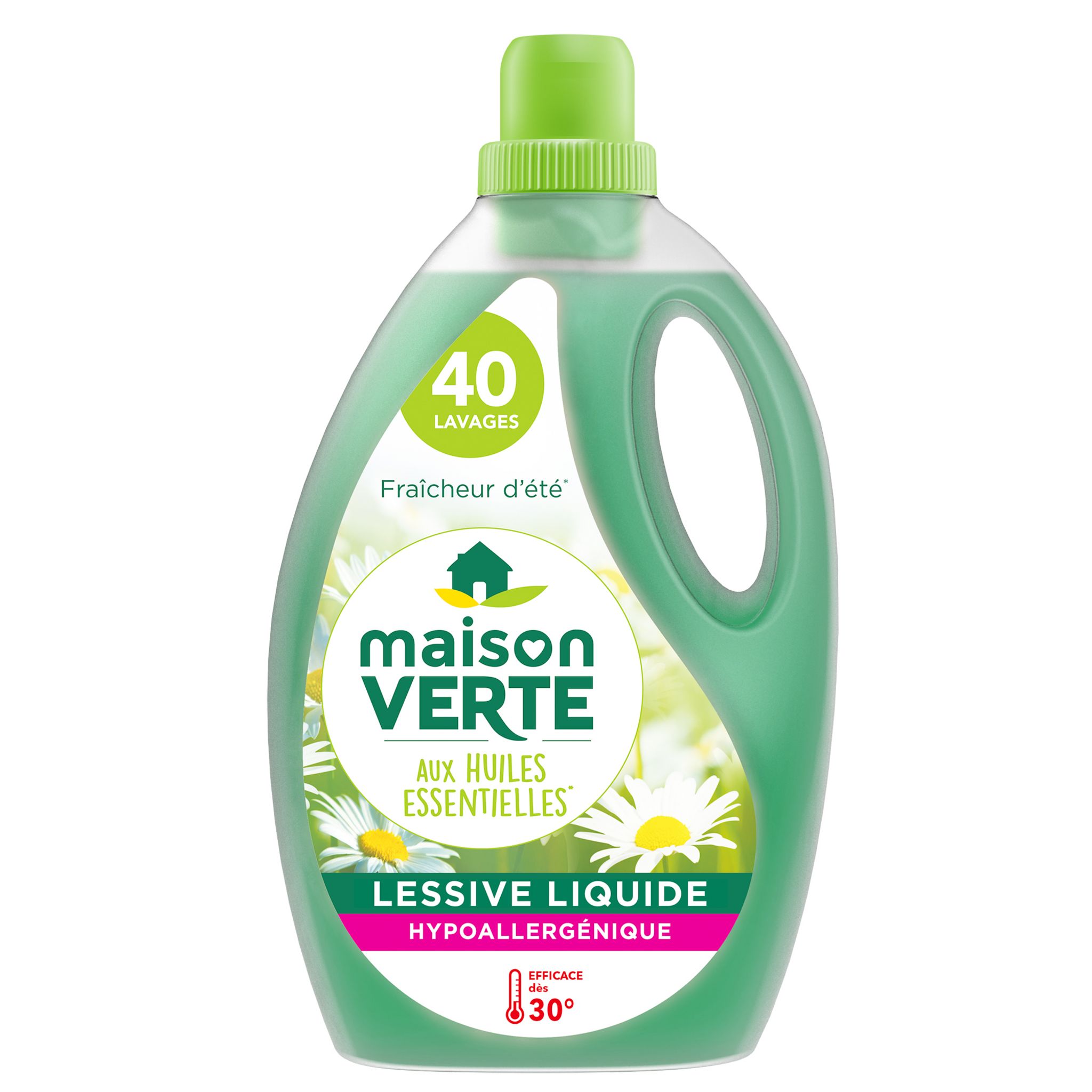 Maison Verte lessive liquide fraîcheur été 40 lavages 2,61l EFFICACITÉ > La lessive liquide concentrée Maison Verte Fraîcheur d’été offre une efficacité de lavage optimale, dès 30°C, pour le blanc et les couleurs, tout en limitant les risques d’allergie. HYPOALLERGÉNIE > Testée dermatologiquement sur des personnes volontaires, la lessive Maison Verte Fraîcheur d’été a été formulée pour minimiser les risques de réactions allergiques. PARFUMS AUX HUILES ESSENTIELLES > Son délicat parfum Fraîcheur d’été, aux huiles essentielles*, laisse sur votre linge une odeur agréable et durable.