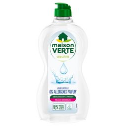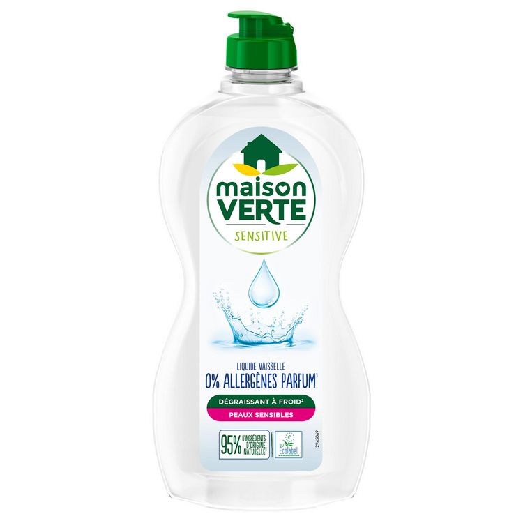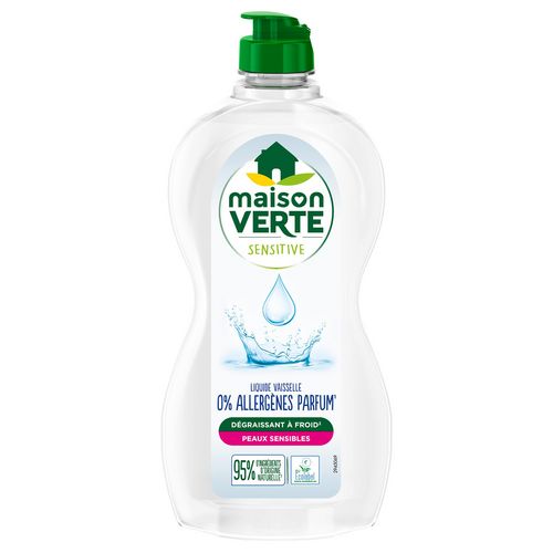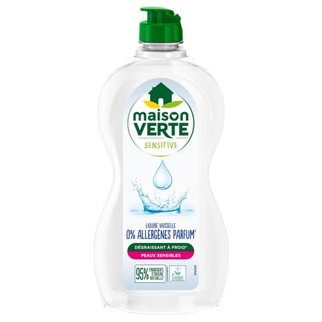 Avec son liquide vaisselle 0%, Maison Verte propose une solution avec une formule dégraissante à froid**, sans parfum ni allergènes* et respectueuse des peaux sensibles. (*Absence d'allergènes cutanés équitables conformément à l'annexe III Partie 1 du Règlement 76/768/EEC, **Test d'efficacité réalisé à froid (20°C))