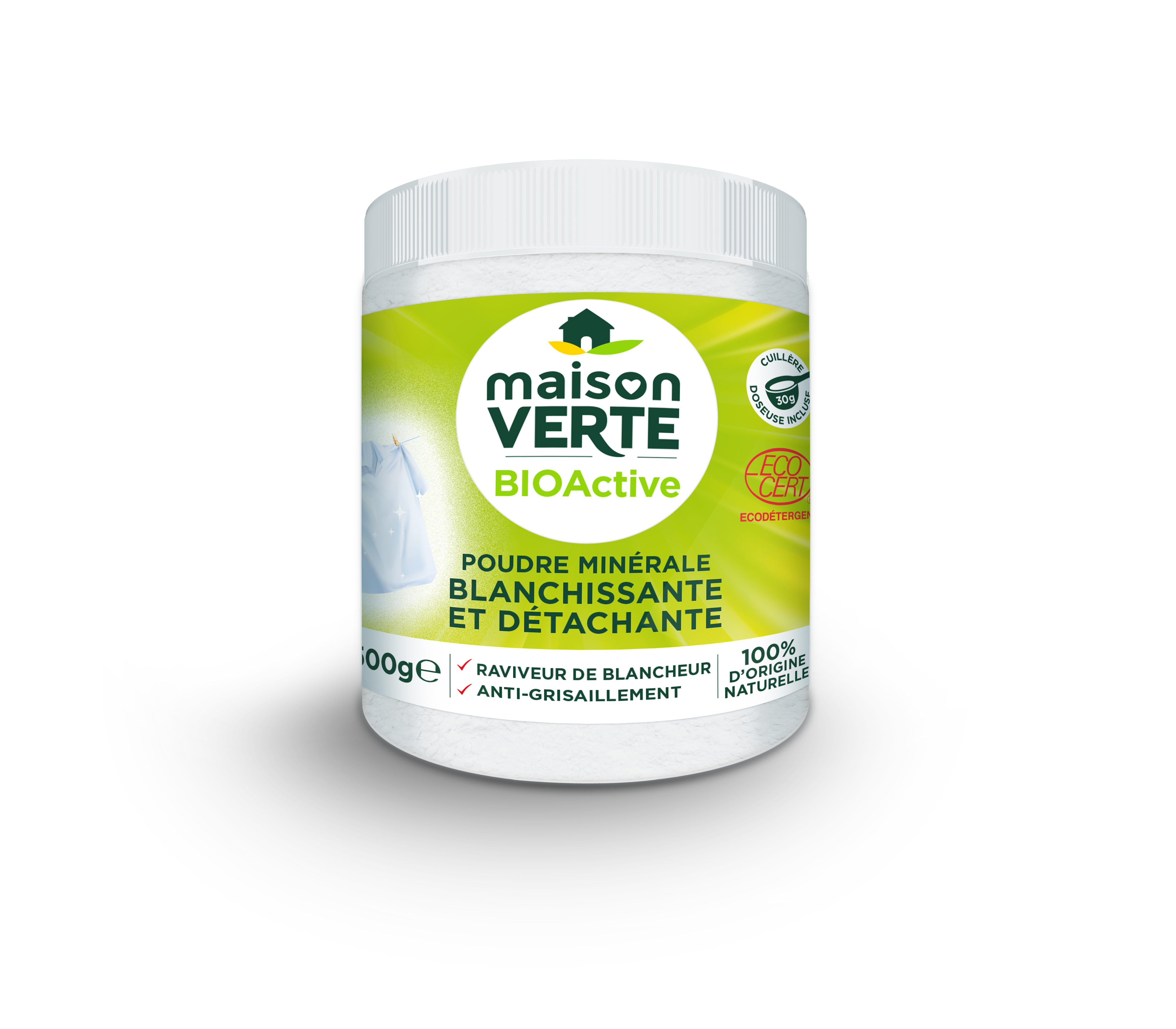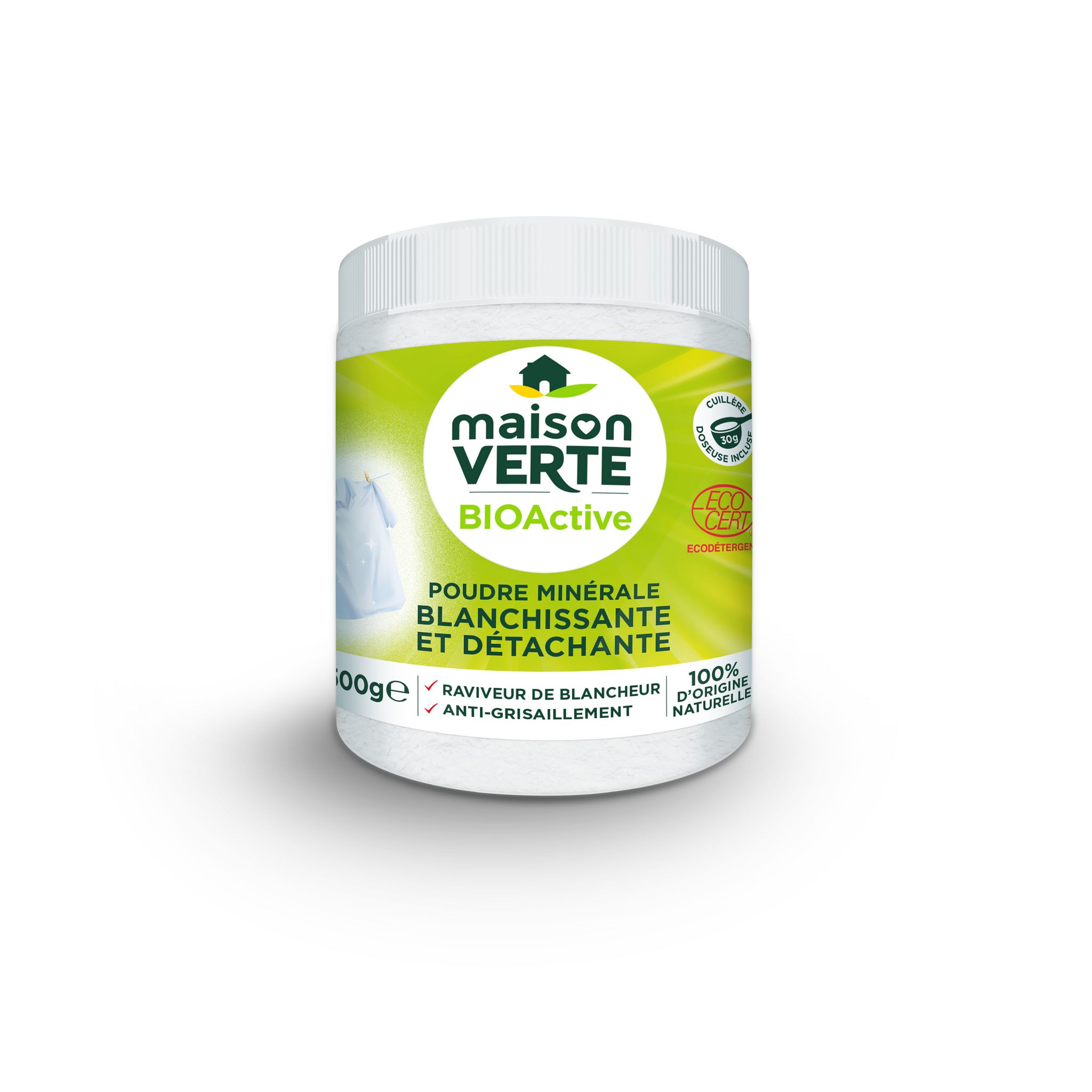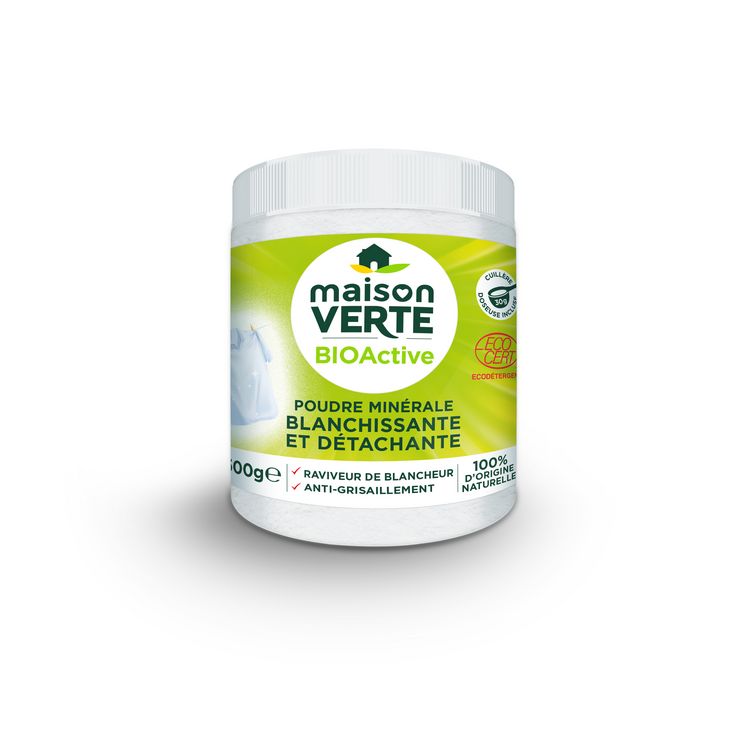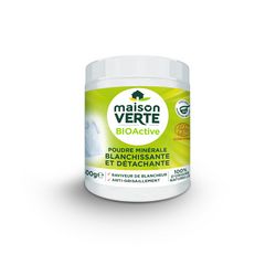 La poudre minérale Maison Verte est détachante et blanchissante et vous offre une efficacité optimale sur le blanc et les couleurs grand teint, sur tous les types de linge sauf laine, soie, daim et cuir. Sa formule 100% d’origine naturelle vous assure un effet anti-grisaillement et raviveur de blancheur, que vous l’utilisiez à la main ou en machine. Une cuillère doseuse est incluse pour vous rendre la tâche plus facile ! aison Verte BIOActive est une marque/gamme déposée de Maison Verte. Elle ne fait pas référence à des composants issus de l’agriculture biologique, mais à des matières actives dont l’origine est naturelle. Maison Verte - Poudre minérale blanchissante 500g