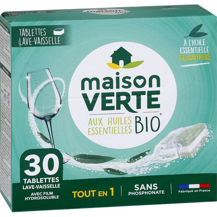 Avec ses nouvelles tablettes lave-vaisselle aux huiles essentielles Bio, Maison Verte vous offre le parfait équilibre entre plaisir et efficacité. Et toujours en respectant davantage l'environnement! Nouvelles tablettes aux huiles essentielles Bio : sa formule nettoie efficacement votre vaisselle! Plus de plaisir et de naturel : ces tablettes sont formulées avec de l'huile essentielle bio d'eucalyptus, et sont sans phosphonate. Film hydrosoluble : évite le contact avec la peau et se dissout parfaitement dans l'eau dès les premières minutes. Maison Verte Lave-vaisselle Tablettes huiles essentielles