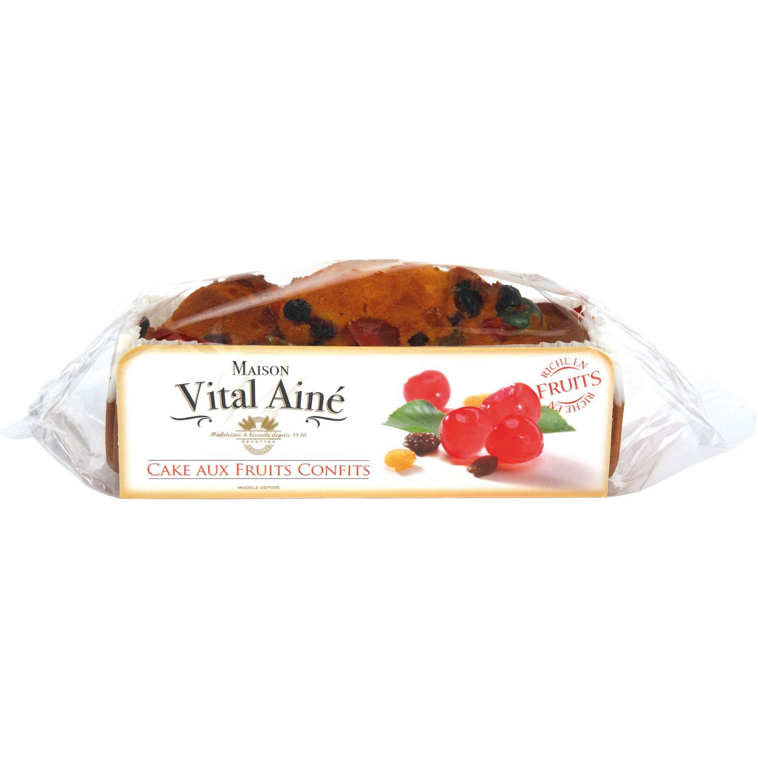 Ingrédients : farine de blé française ; raisins macérés (raisins secs 9,5% réhydratés, rhum) ; cerises confites 15% (cerises Bigarreaux, sirop de glucose fructose, sucre, correcteur d'acidité [acide citrique], colorants [carmins, bleu brillant, érythrosine et caramel ordinaire], conservateur [E220]) ; œufs frais d’Occitanie ; sucre ; huile de tournesol des Landes ; sirop de sucre inverti cristallisé ; écorces d'orange confites 2% (écorces d'orange, sirop de glucose fructose, sucre, correcteur d'acidité [acide citrique], conservateur [E220]) ; écorces de citron confites 2% (écorces de citron, sirop de glucose fructose, sucre, correcteur d'acidité [acide citrique], conservateur [E220]) ; stabilisant (glycérol) ; beurre ; pâte d’écorces d’orange 1,6% (écorces d'orange, sirop de glucose-fructose, saccharose, jus d'orange concentré) ; rhum ; stabilisant (sorbitols) ; poudres à lever (diphosphates et carbonates de sodium) ; sirop de glucose-fructose ; sel ; conservateur (sorbate de potassium) ; extrait de malt d’orge ; gluten de blé ; farine de blé malté ; agent de traitement de la farine (acide ascorbique) ; épaississant (gomme xanthane).