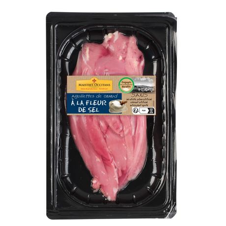 Ingrédients : Aiguillettes de canard saumurées à 6,45% à la fleur de sel : Aiguillette de canard (origine France), eau, fleur de sel 1,5%. A CONSOMMER CUIT A COEUR