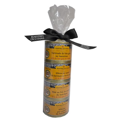 Le coffret comprend : 1 tartinade de foie gras au Sauternes, 1 rillettes pur canard du Sud-Ouest au foie de canard, 1 pâté au foie de canard du Sud-Ouest, 1 rillettes pur canard du Sud-Ouest.