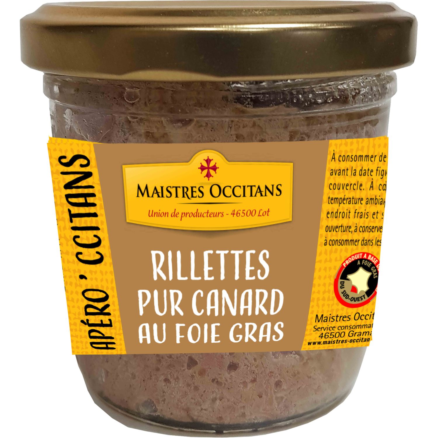 RILLETTE 100% CANARD ISSU D'UN CANARD A FOIE GRAS DU SUD OUEST AVEC 20% DE FOIE GRAS DANS SON BOCAL TWIST OFF