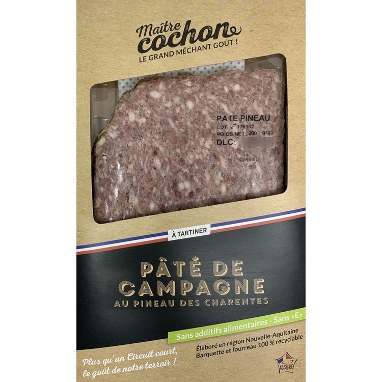 Viande et foie de porc (77%), LAIT entier(origine : France), OEUFS, échalotes, Pineau des Charentes (1,8%)(SULFITES)sel fin, sirop de glucose, arôme naturel, saccharose, plantes aromatiques, ail, poivre, girofle, muscade, cannelle, ferment.