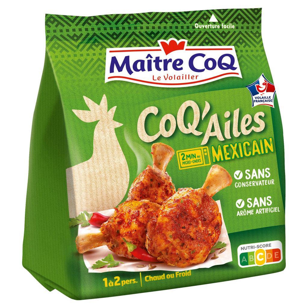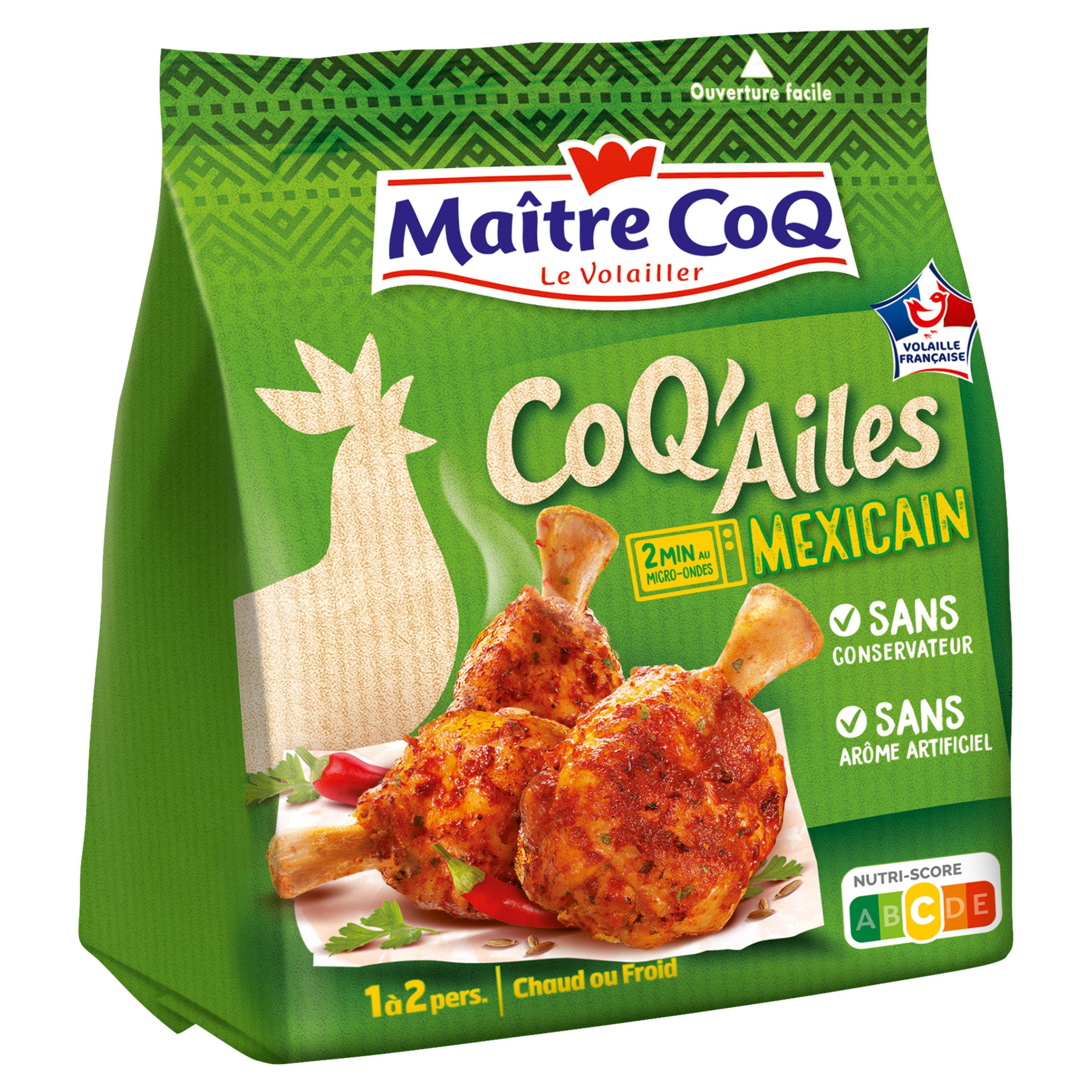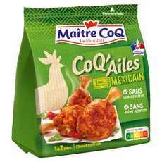 Ingrédients : Manchons de poulet (origine: France), farine de BLE, complexe de minéraux (chlorure de sodium, chlorure de potassium), fibre de BLE, épices (dont piment), plantes aromatiques, maltodextrine, sucre, tomate en poudre, poivron, arômes naturels, huile de tournesol101g de manchons de poulet mis en oeuvre pour 100g de coq'ailes. Traces éventuelles de : soja, lait, oeuf, céléri, moutarde.BLE