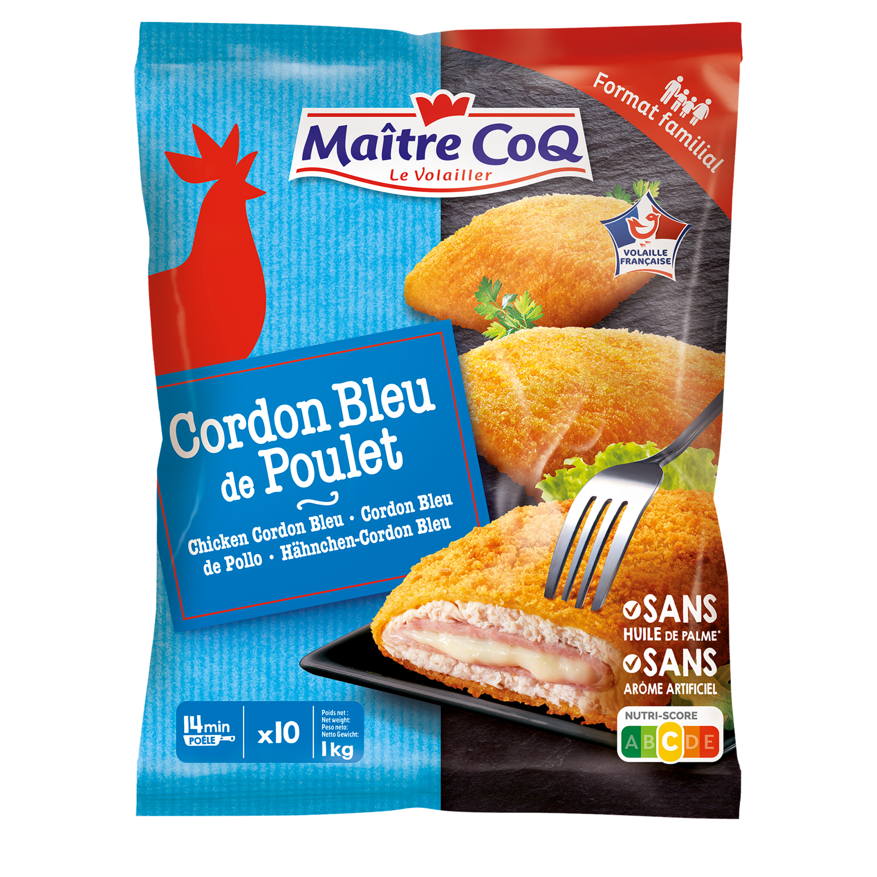 Ingrédients : Viande de volaille traitée en salaison 53% (viande de volaille (viande de poulet 17% (origine : France), viande de dinde 13% (origine : France)) eau, peau de poulet, protéines de SOJA, dextrose, amidon transformé de manioc, sel, arôme naturel), panure (chapelure (farine de BLE, sel, levure, épices), eau, farine de BLE, sel, arôme naturel), jambon de dinde cuit standard 10% (viande de dinde 8% (origine : France), eau, sirop de glucose, protéines de SOJA, fécule de pomme de terre, sel, arômes naturels, gélifiant : algues Euchema transformées, bouillon (bettes et carottes), ferments), fromage fondu 10% (FROMAGES, eau, amidons transformés, LAIT écrémé en poudre, protéines de LAIT, BEURRE, sel de fonte : citrates de sodium, gélifiant : carraghénanes). Frit à l'huile de tournesol. Traces éventuelles de : oeuf, céleri, moutarde.Présence SOJA LAIT BLE FROMAGE BEURRE