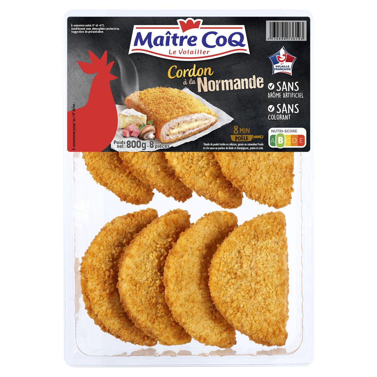 Ingrédients : Viandes de poulet et de dinde traitées en salaison 53% (viande de volaille (viande de poulet 15% (origine : France), viande de dinde 10% (origine : France)), eau, peau de poulet, protéines de SOJA, amidon transformé de manioc, fibre de blé, arôme naturel, sel), panure (chapelure (farine de BLE, sel, levure, épices), farine de BLE, sel, arôme naturel), Camembert fondu 10% (Camembert (LAIT) 3%, eau, BEURRE, FROMAGES, amidons transformés, protéines de LAIT, LAIT écrémé en poudre, lactosérum (LAIT), gélifiant : carraghénanes ), sauce à la Normande 10% (eau, jambon de dinde 2.2% (viande de dinde, eau, sel, protéines de pois, arôme naturel), Emmental (LAIT), champignons de Paris 1%, LAIT, gélatine de boeuf, amidon transformé de manioc, huile de colza, arômes naturels (contient GLUTEN, LAIT), CREME, sucre, maltodextrine, sel, jus concentré de champignon, gélifiant : carraghénanes, épaississant : gomme xanthane, conservateur : sorbate de potassium, jus concentré d'oignon, huile de tournesol). Frit à l'huile de tournesol . Fabriqué dans un atelier qui utilise : céleri, moutarde, oeuf.Présence SOJA LAIT BLE FROMAGE BEURRE CREME lactosérum
