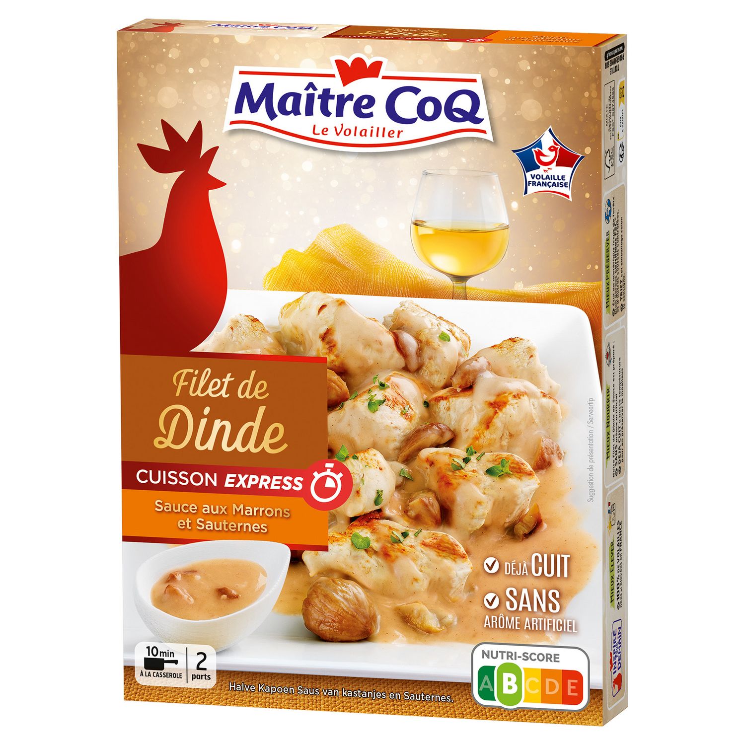 Ingrédients : Filet de dinde 51% (origine : France), sauce aux marrons et au Sauternes 45% (eau, CREME, crème de marron (châtaignes, sucre, sirop de glucose, marrons glacés écrasés, eau, arôme naturel de vanille, Sauternes (dont SULFITES) 3,1%, marrons 3,1%, échalotes, amidon transformé de manioc, BEURRE, sel, purée de gingembre, poivre, mélange quatre épices (poivre, muscade, girofle, gingembre) (dont SULFITES), eau, sel, arôme naturel de poivre avec arômes naturels.Fabriqué dans un atelier qui utilise : gluten, soja, oeuf, céleri, moutarde.