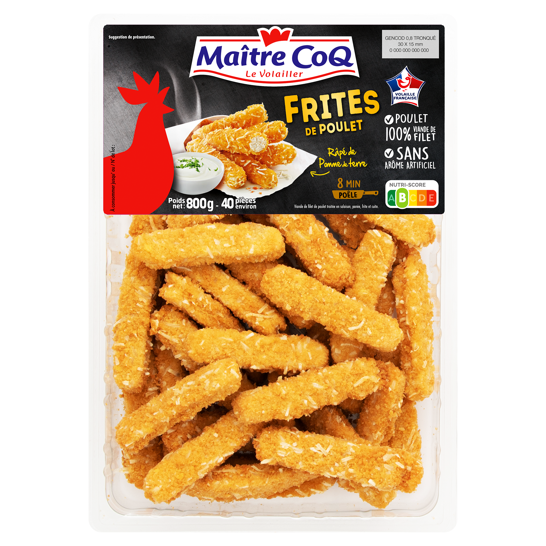 Ingrédients : Viande de filet de poulet reconstituée traitée en salaison 65% (viande de filet de poulet 44% (origine : France), eau, protéine de SOJA, amidon transformé de manioc, dextrose, sel, arôme naturel, arôme naturel de poivre avec autres arômes naturels), panure (chapelure (farine de BLE, épices, sel, levure, flocons de pomme de terre 1,5%), eau, farine de BLE, amidon de BLE, sel, extrait de levure, poudre d'ail, poudre d'oignon, extrait d'épices, extrait de fenouil). Frit à l'huile de tournesol. Traces éventuelles de : lait, œuf, cèleri, moutarde.Présence SOJA BLE