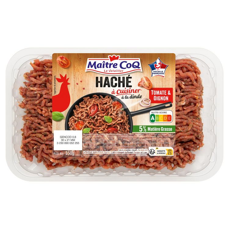 Ingrédients : Viande de dinde 81% (origine : France), eau, poudre de tomate 3%, conservateur : lactate de potassium, oignons frits déshydratés 1,5% (oignons déshydratés, huile de tournesol), sel, acidifiant : acétates de sodium, persil, arôme naturel d'ail, poivre noir. Traces éventuelles de : gluten, soja, lait, œuf, céleri, moutarde.