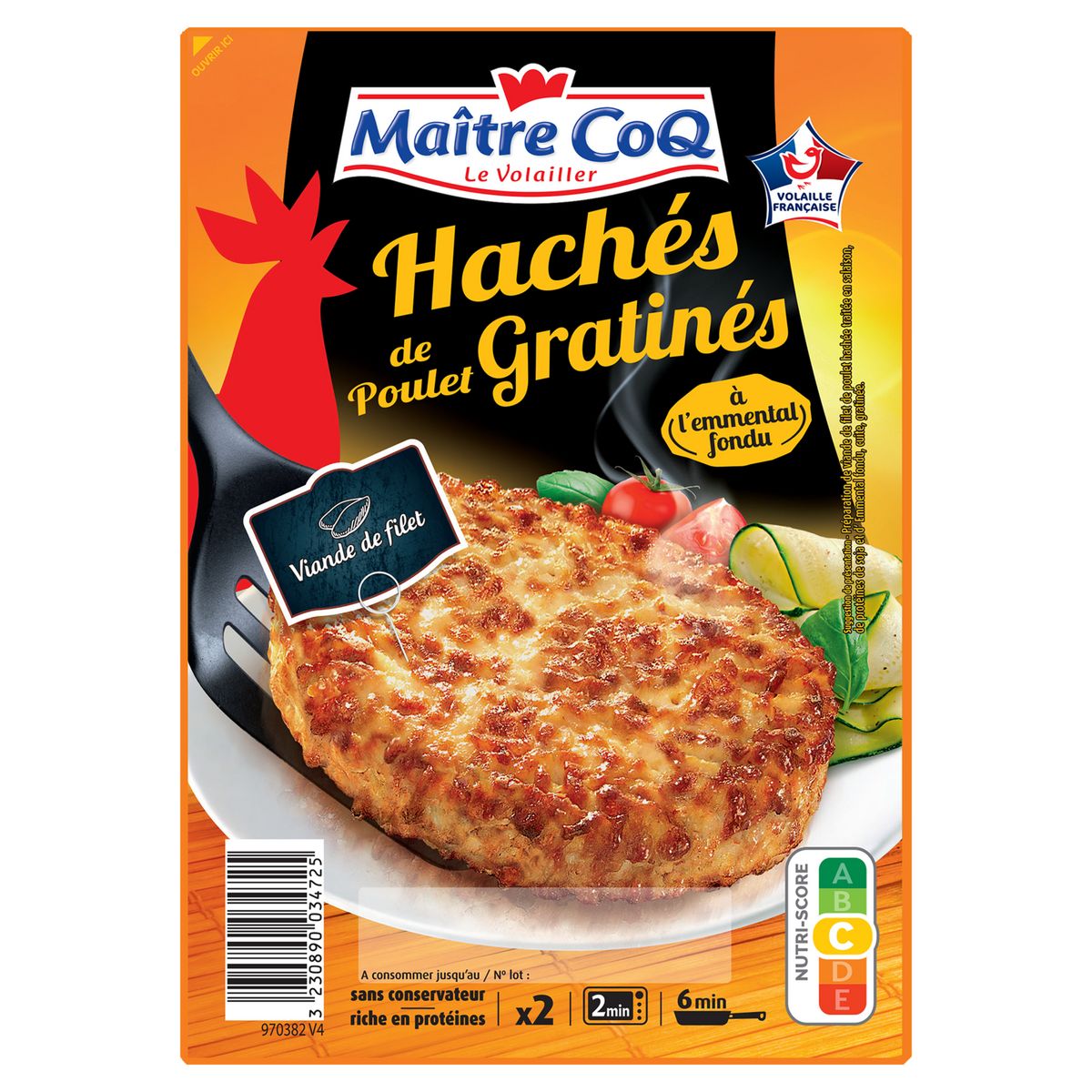 Ingrédients : Préparation de viande de poulet 90% ( viande de filet de poulet 63% (origine : France), eau, protéines de SOJA 7,9%, sirop de glucose, fécule de pomme de terre, arôme naturel de poivre avec autres arômes naturels, sel), Emmental fondu 10% (EMMENTAL (LAIT), FROMAGES, amidons modifiés, eau, poudre de LAIT écrémé, BEURRE). Fabriqué dans un atelier qui utilise : gluten, oeuf, céleri, moutarde.Présence SOJA LAIT FROMAGE BEURRE