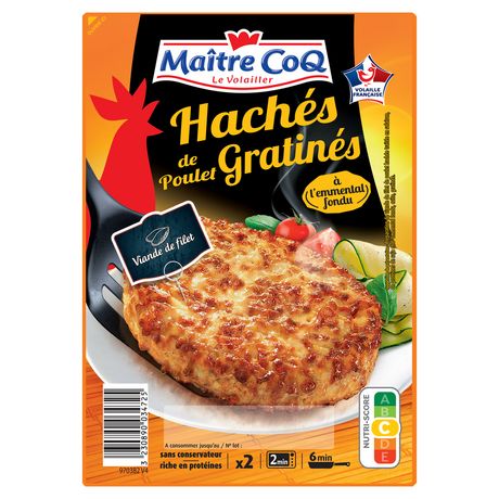 Préparation de viande de poulet hachée traitée en salaison, de protéines de soja et d'Emmental fondu, gratinée et cuite.