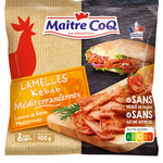 Ingrédients : Viande de poulet 54% (origine : France), viande de dinde 23% (origine : France), eau, amidon transformé de manioc, blanc d'OEUF, sirop de glucose, sel, arômes naturels, épices et plantes aromatiques (dont poivre, cumin, ail et oignon), poudre de tomate 0,4%, farine de riz, amidon de riz, romarin, extrait de romarin, poudre d'ail, poudre d'oignon, poivron rouge, extrait d'épices, huile d'olive extra vierge, huile essentielle d'ail.Malgré tout le soin apporté à la préparation de ce produit, la présence exceptionnelle de fragment d'os n'est pas exclue. Produit fabriqué dans un atelier qui utilise : gluten, soja, lait, céleri, moutarde.