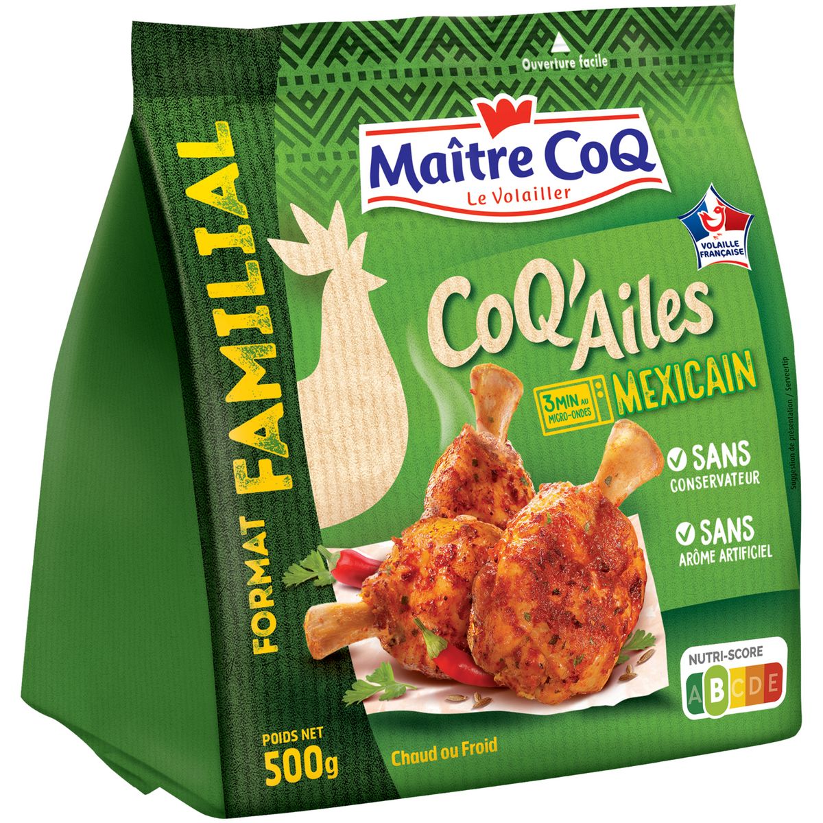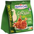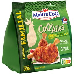 Ingrédients : Manchons de poulet (origine : France), farine de BLE, sel minéraux, fibre de BLE, épices et plantes aromatiques, maltodextrine, sucre, tomates, poivrons, arômes naturels, huile de tournesol. 101g de manchons de poulet mis en oeuvre pour 100g de CoQ'Ailes. Fabriqué dans un atelier qui utilise : soja, lait, oeuf, céléri, moutarde.BLE