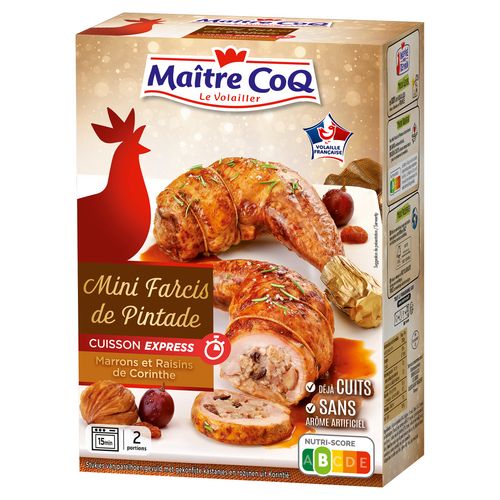 Ingrédients : Cuisse de pintade 73 % (origine : France), farce 26% (viande de dinde (origine : France), eau, marrons confits 3,1% (marrons, graisse de canard), gras de porc, raisins secs de Corinthe 1,1% (raisins, huile de tournesol), sucre, blanc d’OEUF en poudre issu de poule élevée en plein air, sel, épices et plantes aromatiques, arômes naturels), eau, sucre caramélisé. Fabriqué dans un atelier qui utilise : gluten, lait, céleri, soja, moutarde.
