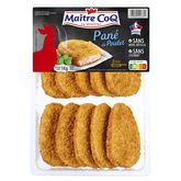 Viande de poulet et de dinde traitées en salaison, panées, frites et cuites.