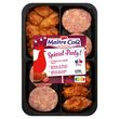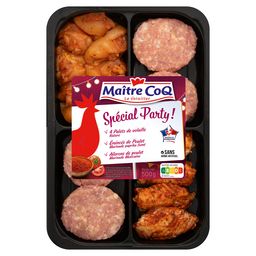 Ingrédients : Chair à saucisse de volaille : viande de dinde 34% (origine : France), gras de veau, eau, conservateurs : lactate de potassium - acétates de sodium -ascorbate de sodium, sel, sucre, épices (dont poivre), plantes aromatiques, huile de tournesol, arômes naturels, fécule de pomme de terre, fibre de blé, antioxydant : acide ascorbique. Ailerons de poulet marinés à la mexicaine : Ailerons de poulet 26% (origine : France), eau, épices (dont piment), plantes aromatiques, arômes naturels, sel, tomate en poudre, poivron en poudre, huile de tournesol, conservateur : vinaigre tamponné. Emincés de cuisses de poulet marinés au paprika fumé : viande de poulet 22% (origine : France), eau, sel, épices (dont paprika fumé en poudre), plantes aromatiques, arôme naturel, huile de tournesol, conservateur : vinaigre tamponné. Traces éventuelles de gluten, soja, lait, oeuf, céleri, moutarde.