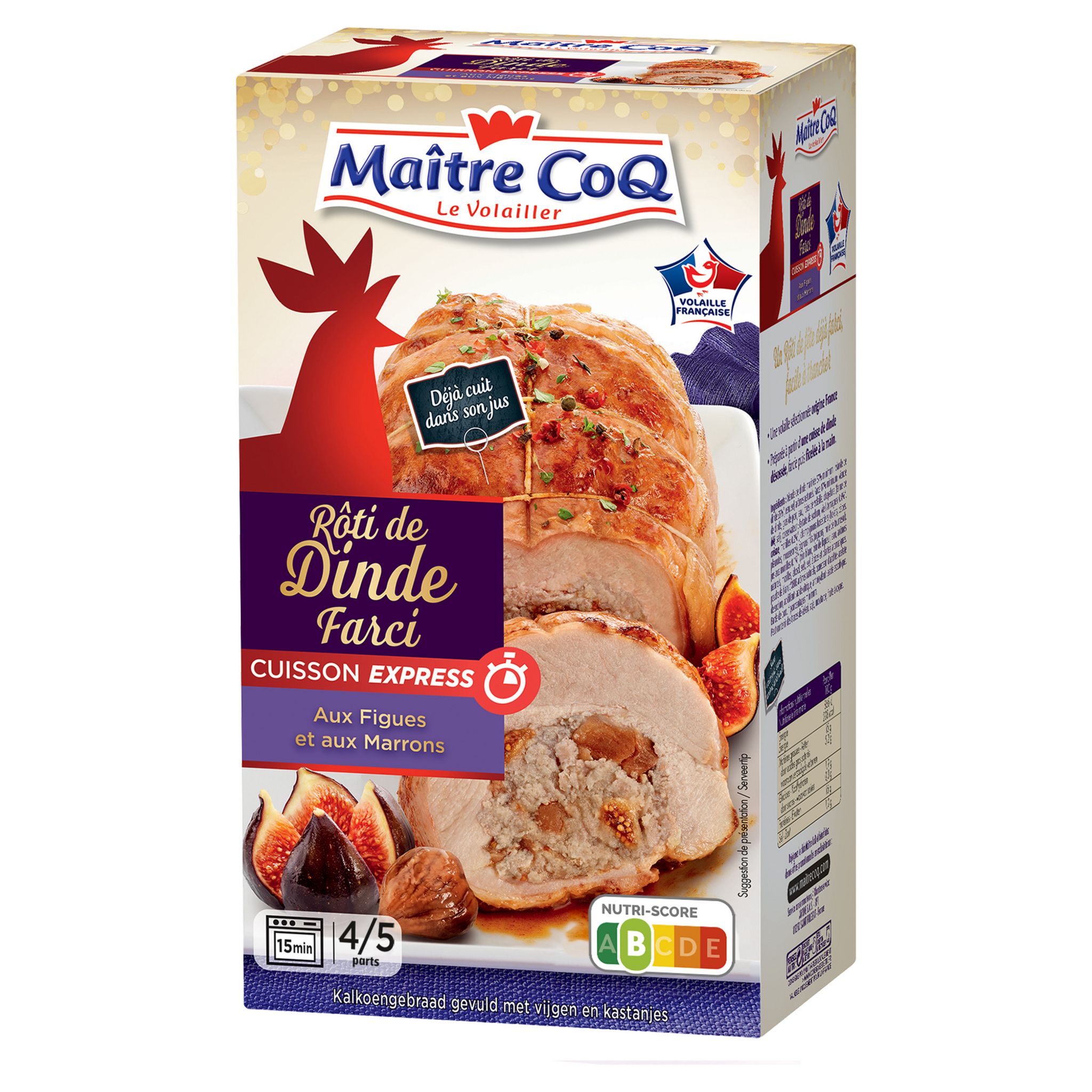 Bonjour Dido, Nous vous remercions pour votre avis concernant le rôti de dinde farci aux figues et aux marrons Maître Coq 700g. Nous sommes désolés d'apprendre que vous n'avez pas suffisamment perçu le goût des marrons et des figues. Nous prenons vos commentaires très au sérieux et allons les transmettre à notre service qualité pour examen. Nous nous efforçons de proposer des produits de qualité et de saveurs intenses, et nous regrettons que ce rôti n'ait pas répondu à vos attentes. Nous espérons pouvoir vous satisfaire au mieux lors de votre prochaine commande. Cordialement.