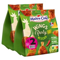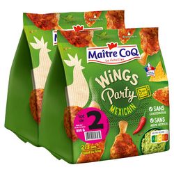 Manchons et ailerons de poulet (origine : France), sel, amidon transformé de tapioca, épices (dont paprika, cumin et piment), sucre, plantes aromatiques, légumes (tomates, poivrons), maltodextrine, arômes naturels, huile de tournesol. 105g de manchons et ailerons de poulet mis en oeuvre pour 100g de wings party.