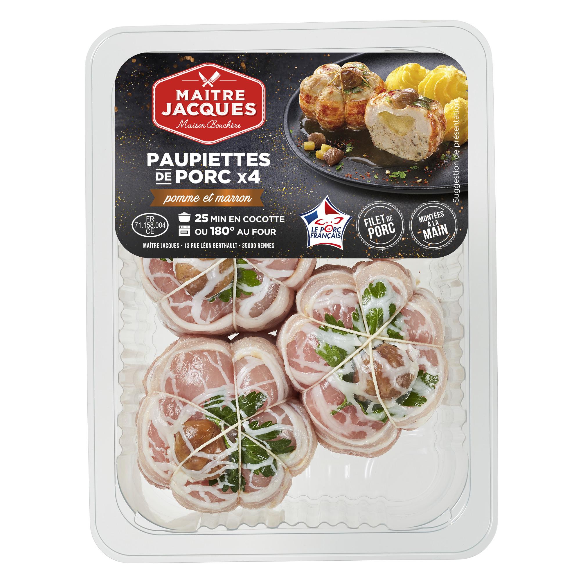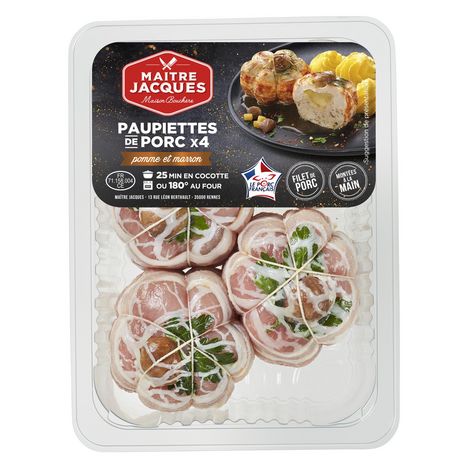 Chair 40% (viande de porc 43%, viande de dinde 26%, LAIT, marrons 6%, OEUF, champignons forestiers 3% (bolets 50%, pleurotes 50%), oignon, raisin sec 1,7% (raisin, huile végétale de coton), sel, chapelure (GLUTEN), arômes et arômes naturels, plantes aromatiques, conservateurs : E250 et E301, acidifiant : E326, sirop de glucose, dextrose, saccharose, armagnac (armagnac, sel, arôme naturel de poivre, colorant E150A), rhum (rhum, sel, arôme naturel de poivre, colorant E150A), porto (porto rouge (SULFITES), sel, arôme naturel de poivre), persil), escalope de porc 32%, poitrine fumée (poitrine de porc, sel, conservateurs : E508 et E250, dextrose, antioxydant : E316), pommes caramélisées 8,0% (pommes séchées (dont sucre, acidifiant : E330, arôme, antioxydant : E220 (SULFITES)), eau, caramel (1%), arôme naturel caramel (1%), conservateur : E202 (0,1%)), marrons 3,2%, crépine de porc (acidifiants: E270, E330 et E334), persil.