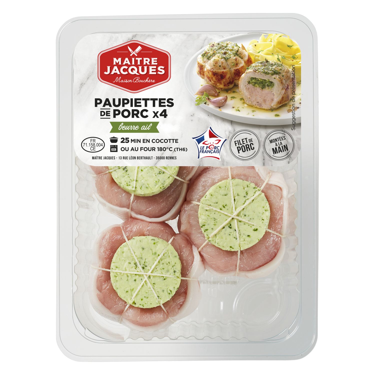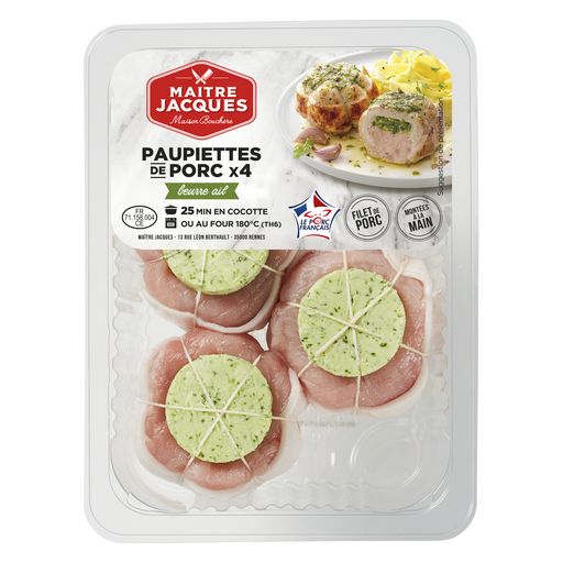 Maître Jacques vous propose des paupiettes de porc beurre ail ultra-gourmandes soigneusement montées à la main et ficelées melon, élaborées avec des ingrédients de qualité.