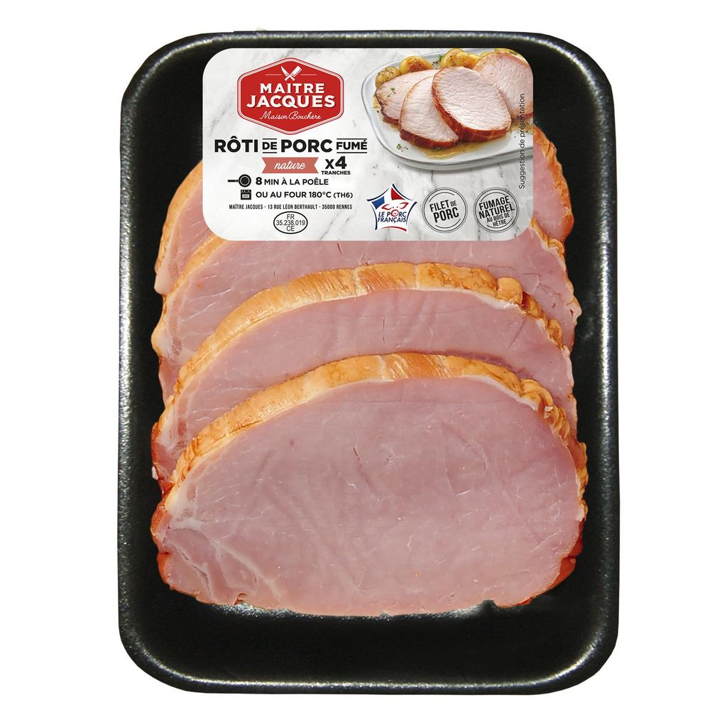 Maître Jacques vous propose un rôti de porc fumé 4 tranches, une recette authentique élaborée avec de la viande de porc française fumée naturellement au bois de hêtre.