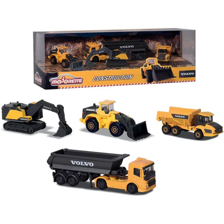 En savoir +Un coffret Majorette réunissant 4 modèles de véhicules de chantier à roue libre sous licence Volvo : pelleteuse, chargeuse sur pneus, dumper, et camion benne.Échelle 1/64.A partir de 3 ans. Age minimum : 3 ans